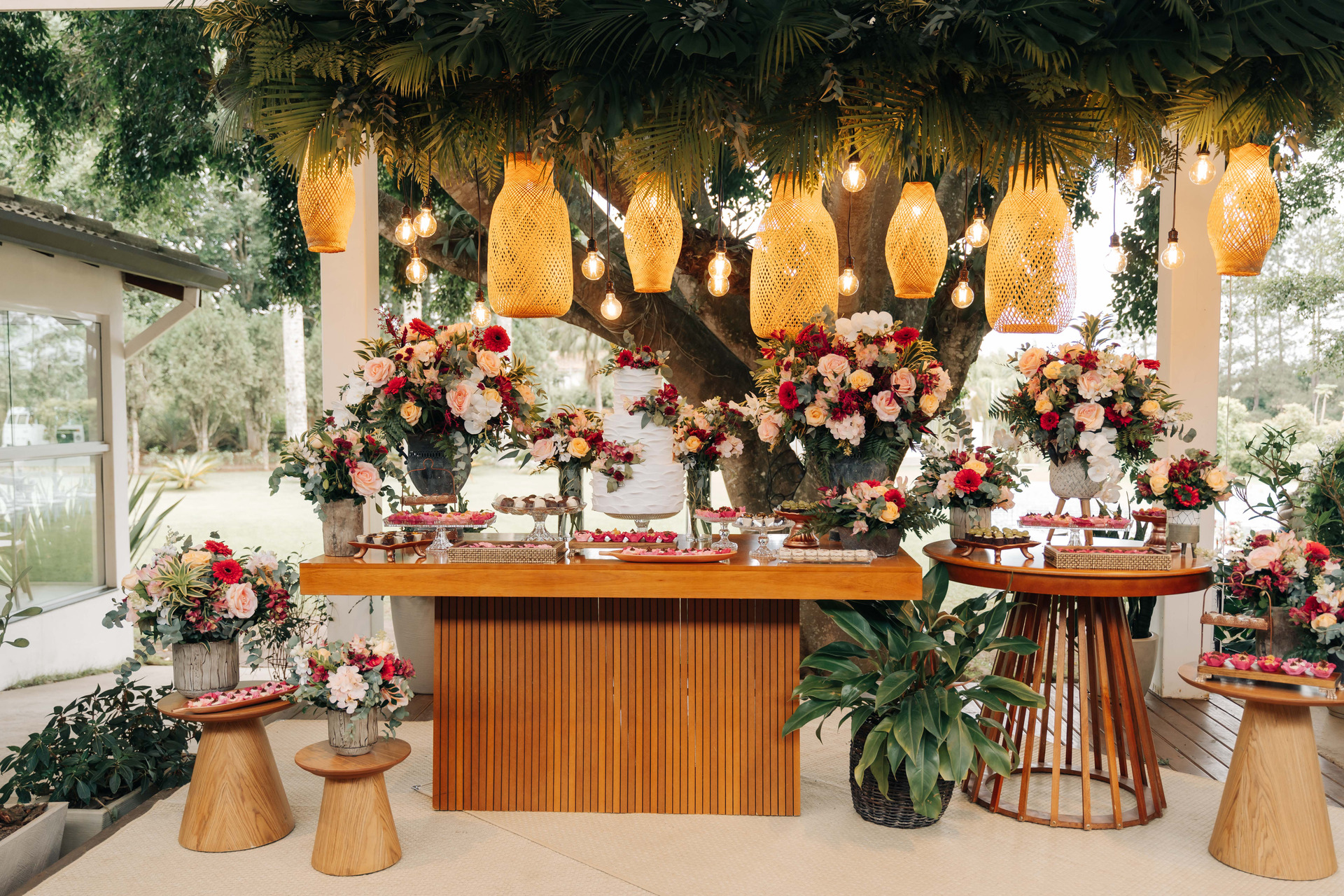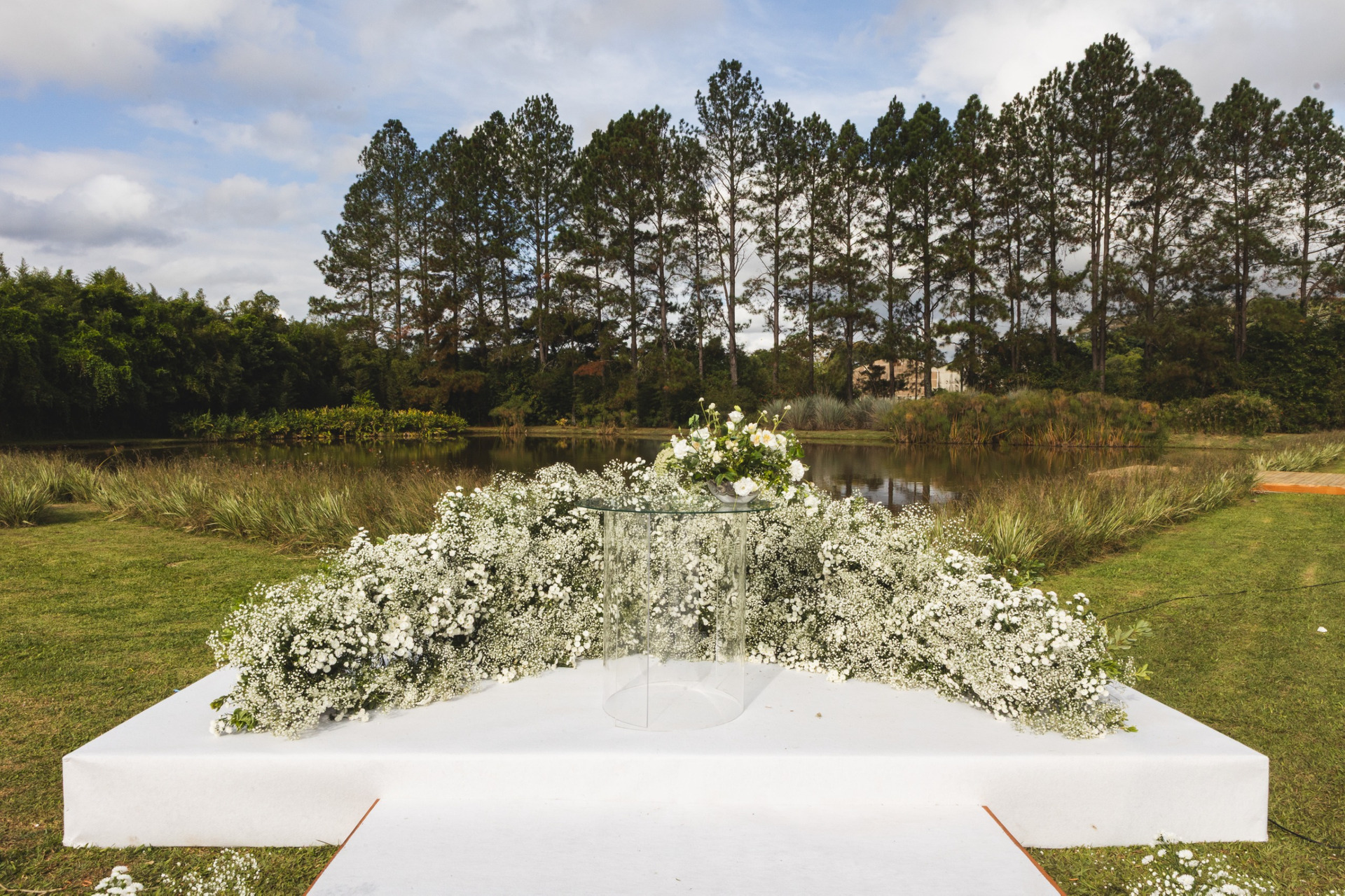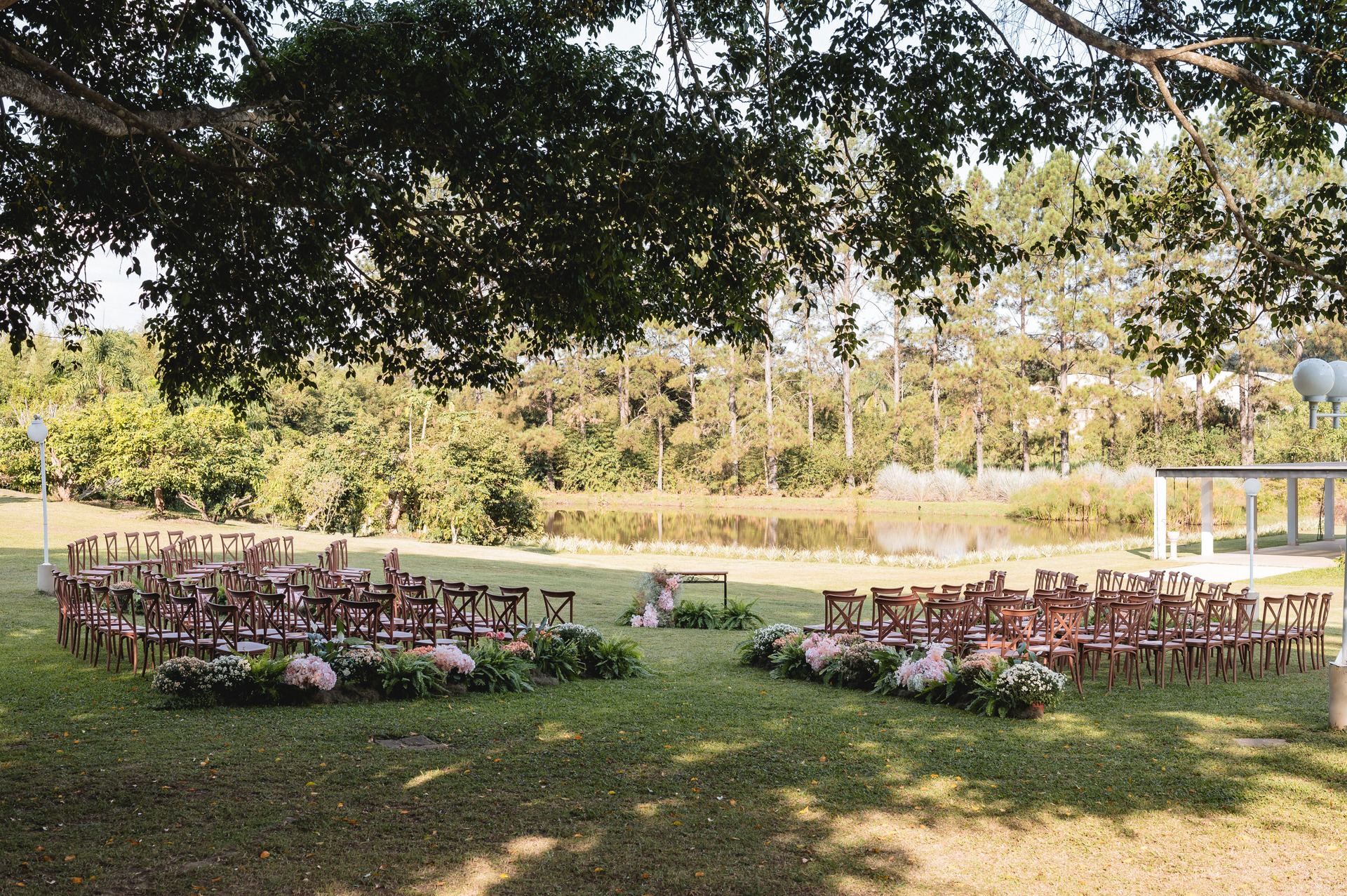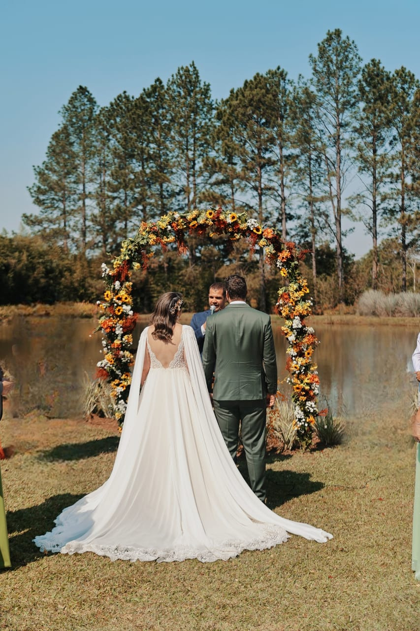 Contamos também com uma belíssima área de jardim, um lago e um imenso gramado. Além do estacionamento, cozinha de apoio e a sala da noiva.